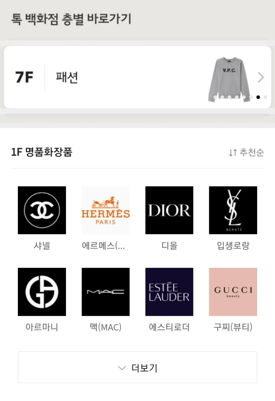 톡 백화점에 입장하면, 1층에 여러 화장품 브랜드가 입점해있는 것을 확인할 수 있다. 이처럼 톡 백화점은 브랜드의 종류에 따라 층별로 분류해 마치 진짜 백화점 건물에 들어선 듯한 느낌을 준다.