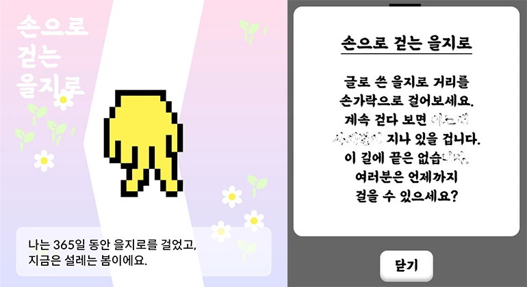 에디터가 가장 인상깊었던 전시는 바로 ‘손으로 걷는 을지로’다. PC는 키보드 방향키, 모바일은 스크롤을 활용해 을지로 거리의 사계절을 경험해 볼 수 있다. 길거리를 걷는 내내 각 계절에 어울리는 말풍선을 확인할 수 있는데 이를 읽는 재미도 쏠쏠했다.