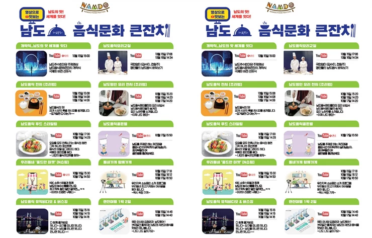 유튜브에 ‘남도음식문화큰잔치TV’ 채널을 이미 개설했으며 22개 시군 대표음식 조리법(레시피) 등 축제와 관련된 영상을 미리 감상할 수 있다.