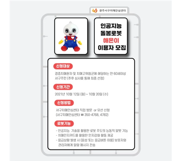 광주시 서구(구청장 서대석)가 오는 20일까지 어르신 말동무 인공지능 돌봄로봇 ‘해온이’를 지원할 지역 내 치매환자 및 노인맞춤돌봄 대상자를 모집한다.