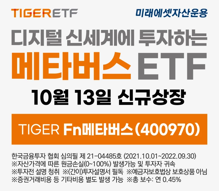 미래에셋자산운용은 신규 상장하는 '타이거(TIGER) Fn메타버스 ETF'(상장지수펀드) 거래고객을 대상으로 이벤트를 진행한다고 13일 밝혔다.