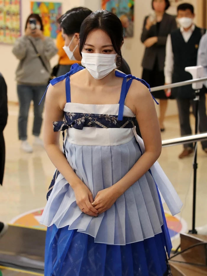 사진 속 은지는 저고리를 입지 않는, 스타일의 개량 한복을 입고 있다. 무릎까지 오는 짧은 길이의 치마에 더 짧은 치마를 덧대고 어깨 끈으로 고정했다. 마치 오프숄더 드레스처럼 어깨와 양팔이 완전히 드러났다. 여기에 검은색 메리제인 구두를 신었다.