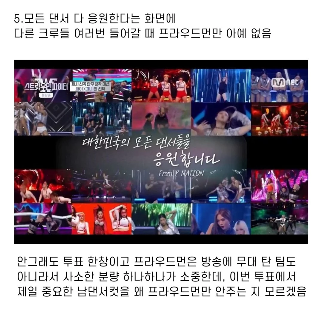 해당 글을 작성한 네티즌은 "프라우드먼만 풀파티, 선상파티 입장 컷이 없다. 남자 댄서 소개, 설명, 입장 컷도 안 나왔다. 제시랑은 리허설에서 문제 있는 것처럼 보여주더니 실제로는 2위였다"고 설명했다.