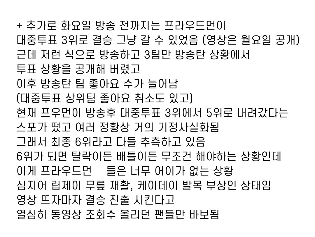 그러면서 "모든 댄서들 다 응원한다는 화면에 프라우드먼만 없다. 또 방송에서 투표 상황을 공개하면서 프라우드먼이 순위가 내려갔다. 최종 6위설이 나오는데 6위가 되면 배틀을 해야 하는데 립제이랑 케이데이는 부상을 입은 상태다. 팬들만 바보 만드는 중이다"라고 부연했다.