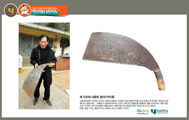 붕어톱을 소장하고 있는 배 목수 신영길 씨(80, 고흥군 봉래면)는 “어릴 적에 할아버지로부터 고조부, 증조부께서 모두 배 목수였으며, 울릉도를 오가며 배를 짓는 일을 하셨다는 말씀을 자주 들었다”며 “할아버지께서 배 목수인 저에게 거두(붕어)톱을 물려주시며 ‘고조부, 증조부님이 울릉도에서 배를 만들 때 사용하시던 톱’이라고 하시던 말씀을 또렷이 기억한다”고 말했다.