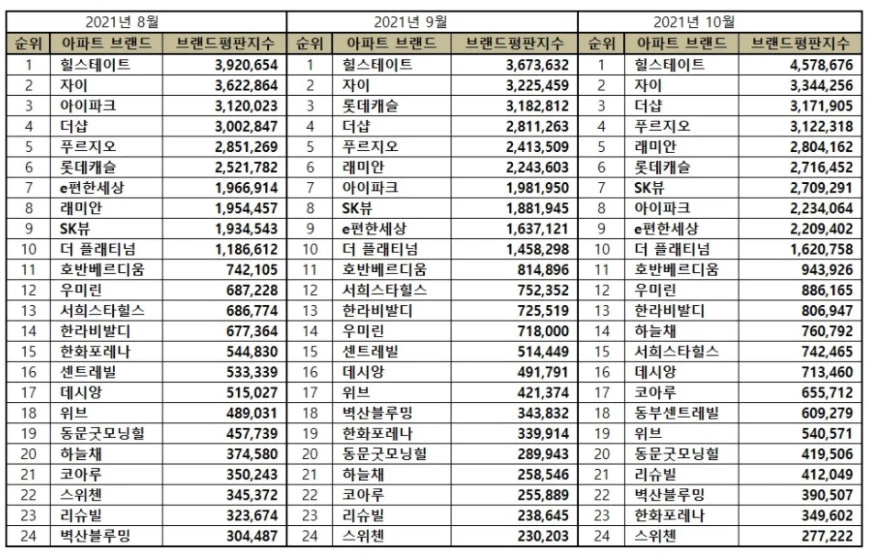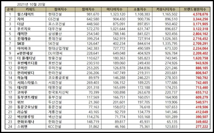 아파트 ‘10월 브랜드평판' 순위가 발표돼 이목을 모으고 있다.