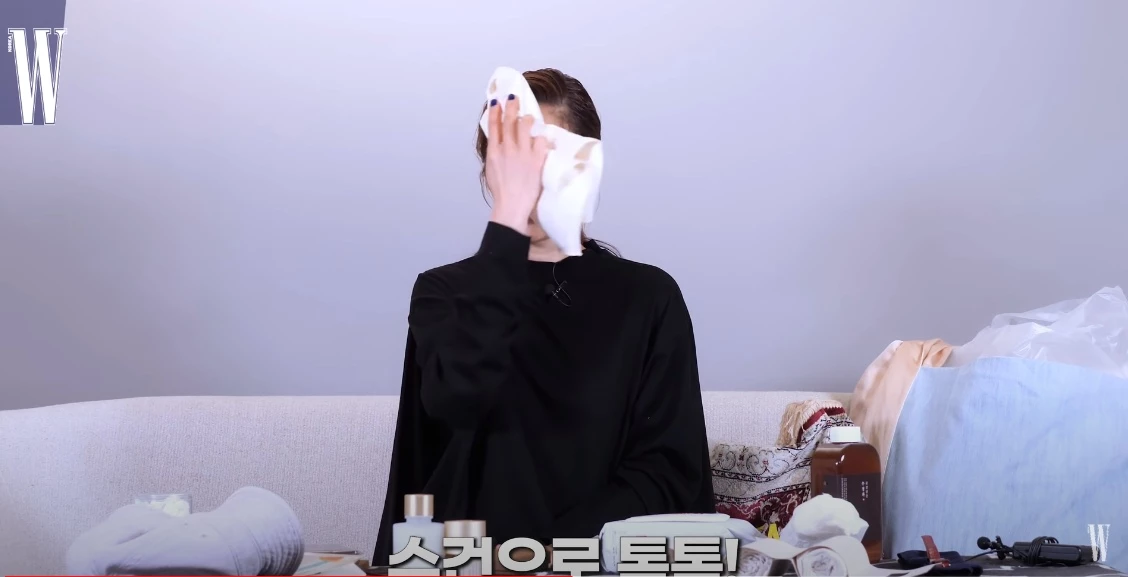 고현정은 "보통 세안 후 수건으로 얼굴을 비벼서 닦으신다. 그런데 그거는 안 좋다"며 "찍어 누르듯 톡톡 닦으시는 게 피부에 좋다"고 설명했다.