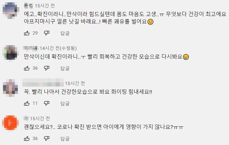 글을 본 유튜브 이용자들은 "만삭이신데 확진이라니 너무 걱정된다. 빨리 회복하고 건강한 모습으로 다시 보길 기도하겠다", "임신 중에 확진이면 아기도 임산부도 힘들 텐데 잘 이겨냈으면 좋겠다", "아기가 건강하길 기도한다. 빨리 나아라", "만삭이신데 어떡하냐. 꼭 쾌차하시길 바란다", "빨리 낫고 아이에게도 영향이 없길 바란다", "진짜 걱정이다. 꼭 좋은 소식 기다리겠다" 등 댓글을 남기며 응원했다.