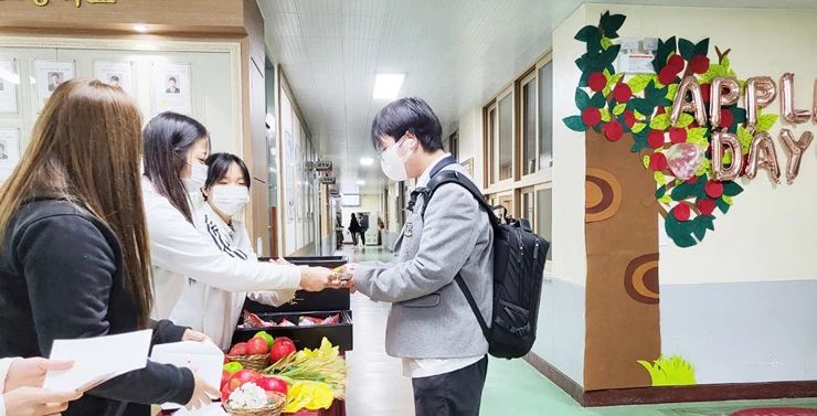 24일 동일미래과학고에 따르면 ‘애플데이’는 학생자치회가 주도했다. 미안한 마음이 담긴 편지와 사과(과일)를 주고 받으며 본인의 행동으로 인해 상처 받은 친구나 교사에게 미안한 마음과 고마움을 전달하는 방식으로 진행됐다.
