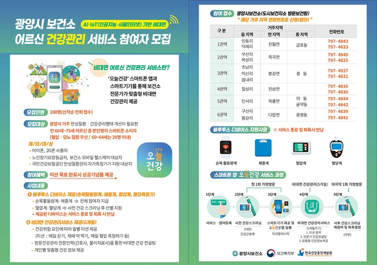 광양시보건소는 2021년 보건복지부가 추진하는 AI·IoT(인공지능·사물인터넷) 어르신 건강관리서비스 시범사업에 선정되어, 만 60~75세 어르신 중 본인 명의 스마트폰 소지자 중 사업 참여자 200명을 선착순 모집한다.