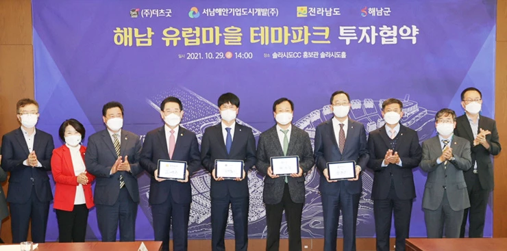 29일 솔라시도CC 홍보관에서 열린 투자협약식에는 김영록 전라남도지사와 명현관 해남군수, 김태형 ㈜더츠굿 대표이사, 채정섭 서남해안기업도시개발㈜ 대표이사가 참석해 국내 최고의 유럽형 관광도시 조성에 상호 협력해 나가기로 했다.