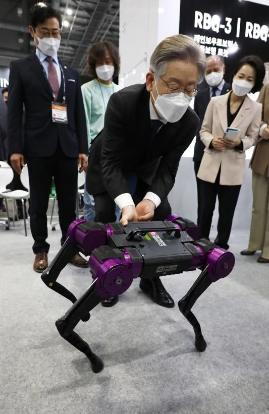 이 후보는 자유롭게 좌우로 움직이고 공중제비를 하는 한 4족 보행 로봇을 봤다. 현장 관계자는 이 후보에게 "이 로봇은 밀려도 잘 넘어지지 않는다"라고 설명했다.