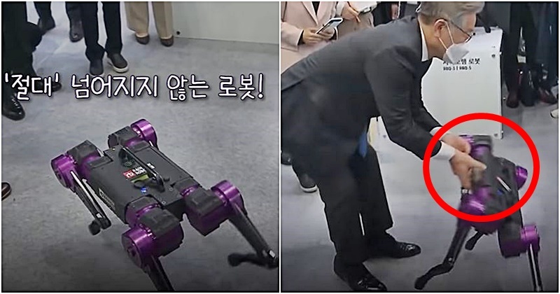 해당 영상에서 이 후보는 한 참가업체의 사족보행 로봇을 손으로 굴려 넘어뜨렸고, 로봇은 스스로 일어나지 못했다.