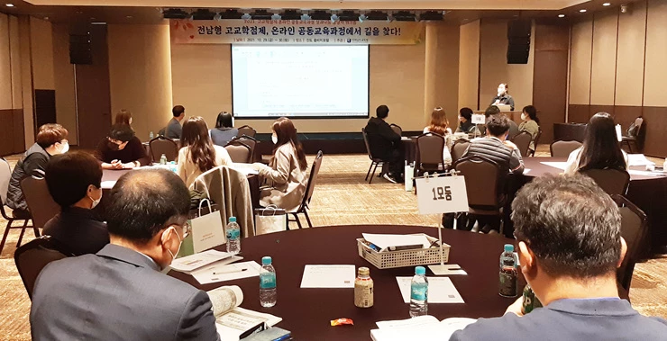 이와 관련, 도교육청은 지난 10월 29일(금) 진도쏠비치호텔에서 온라인 수업교사 30명이 참석한 가운데‘2021.고교학점제 온라인 공동교육과정 성과나눔 담당자 워크숍’을 개최했다.