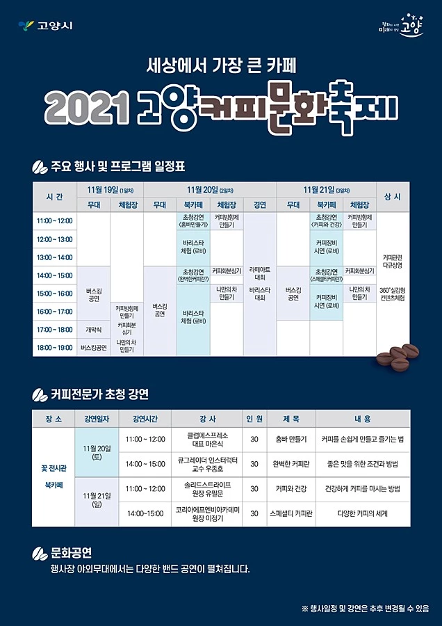 고양커피문화축제는 11월 19일부터 21일까지 3일간 일산호수공원 주제광장과 꽃전시관 일대에서 열린다.