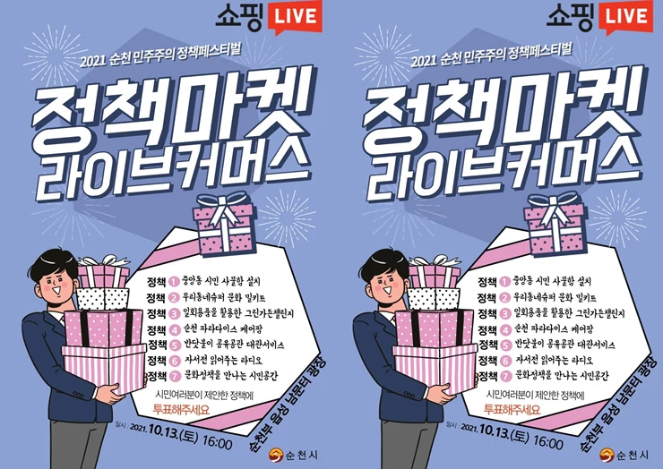 이번 정책 마켓은 순천 민주주의 정책페스티벌 행사를 통해 시민이 제안한 정책을 쇼호스트가 쉽고 재미있게 설명한 후, 시민들이 현장 투표를 통해 구매하는 라이브커머스 방식으로 진행된다.