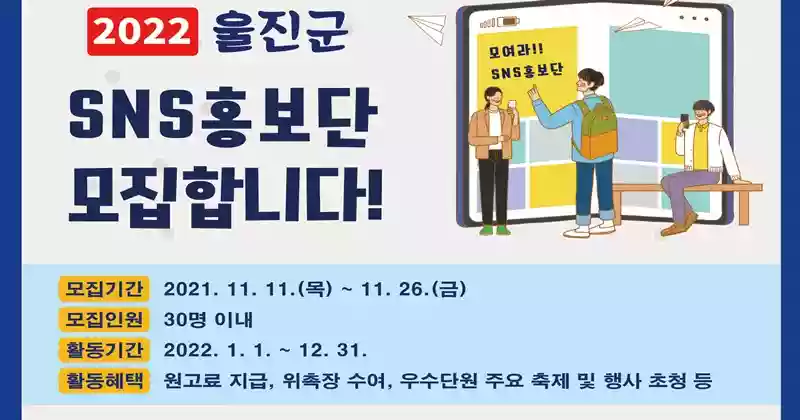 울진군(군수 전찬걸)은 영향력이 확산되고 있는 SNS를 통해 울진의 현장감 있는 다양한 콘텐츠를 효율적으로 홍보하고자 오는 26일까지 SNS 홍보단을 30명 이내로 모집한다고 밝혔다.