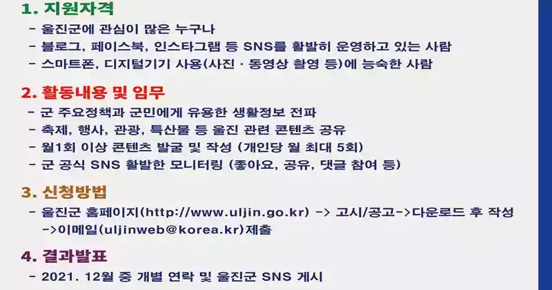 지역과 연령에 제한은 없으며, 울진군에 관심이 많고 블로그·페이스북·인스타그램·유튜브 등 SNS를 활발히 운영하면서 월 1건 이상 콘텐츠 작성이 가능한 국민이면 누구나 지원이 가능하다.
