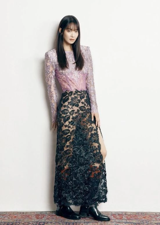 화보 속 신민아는 파격적인 패션을 선보이고 있다. 누드톤 시스루룩을 입은 모습이다.