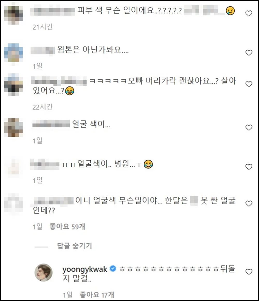 평소와는 조금 다른 그의 얼굴에 네티즌들은 걱정을 표했다. 네티즌들은 "피부색 무슨 일이에요?", "얼굴색이...", "얼굴색이...병원…. ㅜ" 등의 댓글을 남겼다. 또 한 네티즌이 "얼굴색이 무슨 일이야. 한 달은 화장실을 못 간 얼굴인데?"라고 농담을 건네자 곽윤기가 "뒤돌지 말걸"이라며 유쾌한 답변을 남기기도 했다.