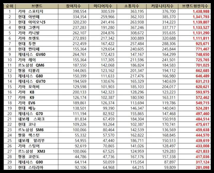 ‘국산자동차 브랜드평판 11월 빅데이터 분석 30위’ 전체 순위는 스포티지, 아반떼, 아이오닉5, 그랜저, 카니발, 쏘렌토, 투싼, 싼타페, GV60, 레이, QM6, 티볼리, G80, GV70, 모하비, K8, K9, EV6, 베뉴, G70, 스파크, 코나, SM6, 렉스턴, 말리부, 스팅어, XM3, 코란도, G90, 스타리아 순으로 분석됐다.