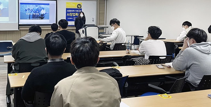 이날 특강에서는 한국인공지능협회 신선진 박사를 초청, 인공지능 관련 창업 아이디어 제시 및 인공지능 경진대회 사례들을 설명하는 시간을 가졌다.
