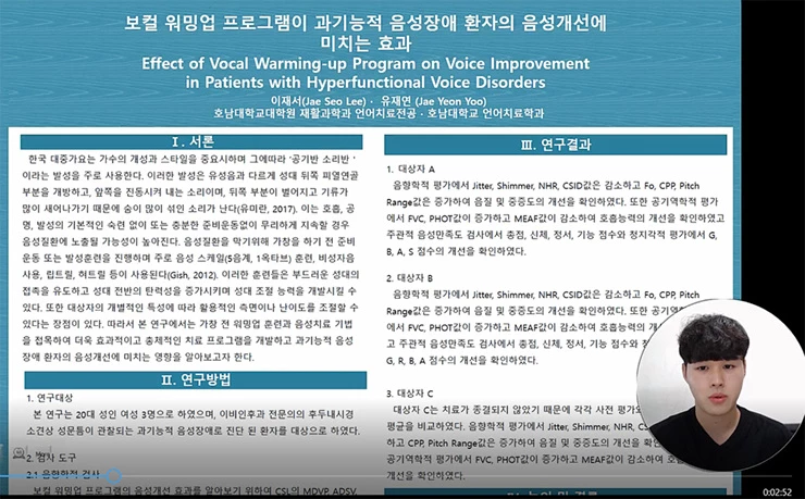 학술발표에 참가한 양재희(언어치료전공 4학기)씨는 “코로나 19로 인한 마스크 착용으로 발화의 피로도와 음질 문제와의 관련성을 살펴본 이번 연구를 통해, 마스크 착용이 음성에 미치는 영향을 소개하는 좋은 발표 경험을 했다”고 학술대회 참가 소감을 밝혔다.