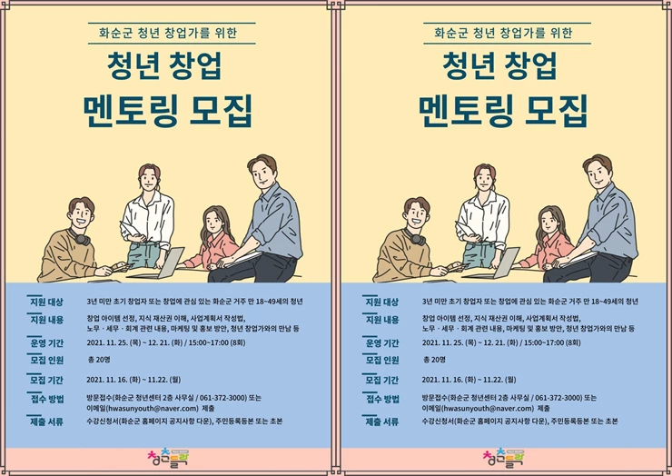 화순군(군수 구충곤)이 창업을 준비하거나 관심 있는 청년을 지원하는 ‘2021 청년 창업 멘토링’을 운영한다.