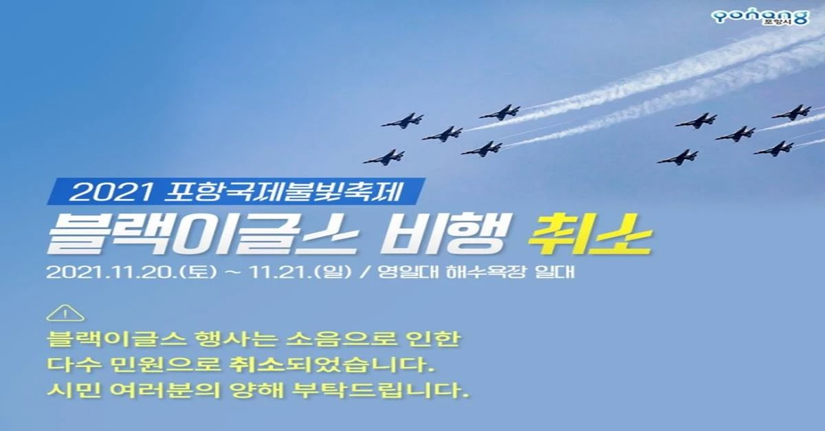 포항시는 지난 19일 “블랙이글스 비행행사는 소음으로 인한 다수 민원으로 취소됐다”고 밝혔다.