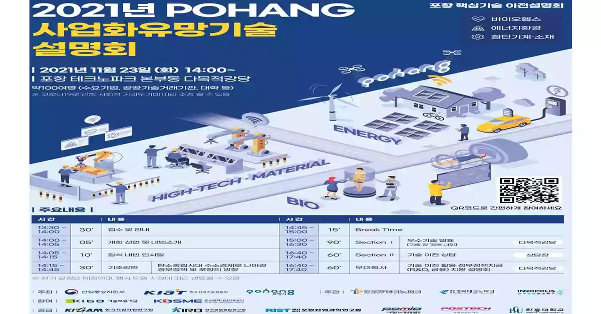 이번 기술설명회는 한국지질자원연구원, 한국로봇융합연구원, 포항산업과학연구원, 포항금속소재산업진흥원, 포항공과대학교, 한동대학교 등 총 6개의 공급기관이 참석해 바이오헬스, 에너지환경, 첨단기계・소재 분야에서 112개의 우수 유망기술이 출품된다.