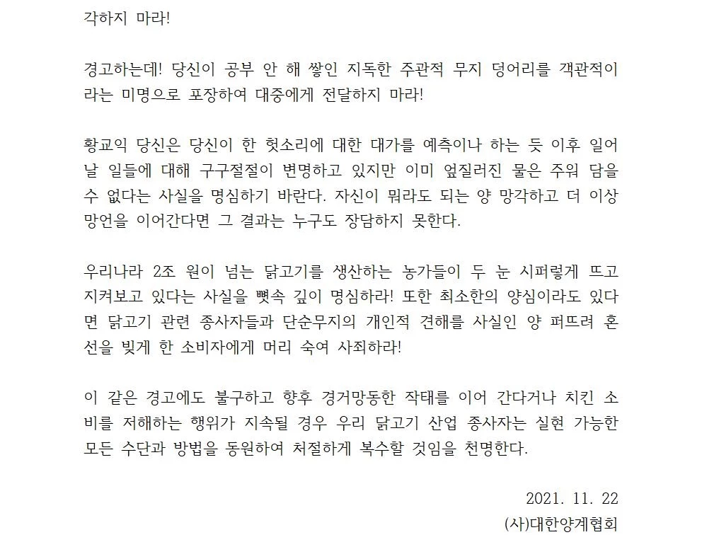 또 "경고하는데 당신이 공부 안 해 쌓인 지독한 주관적 무지 덩어리를 객관적이라고 포장해 대중에게 전달하지 말라. 자신이 뭐라도 되는 양 망각하고 더이상 망언을 이어나가면 결과는 누구도 장담하지 못한다"라며 "2조 원이 넘는 닭고기를 생산하는 농가들이 두 눈 시퍼렇게 뜨고 있다는 사실을 뼛속 깊이 명심하고 단순 무지의 개인적 견해에 혼란을 빚은 소비자에게 사죄하라"라고 경고했다.