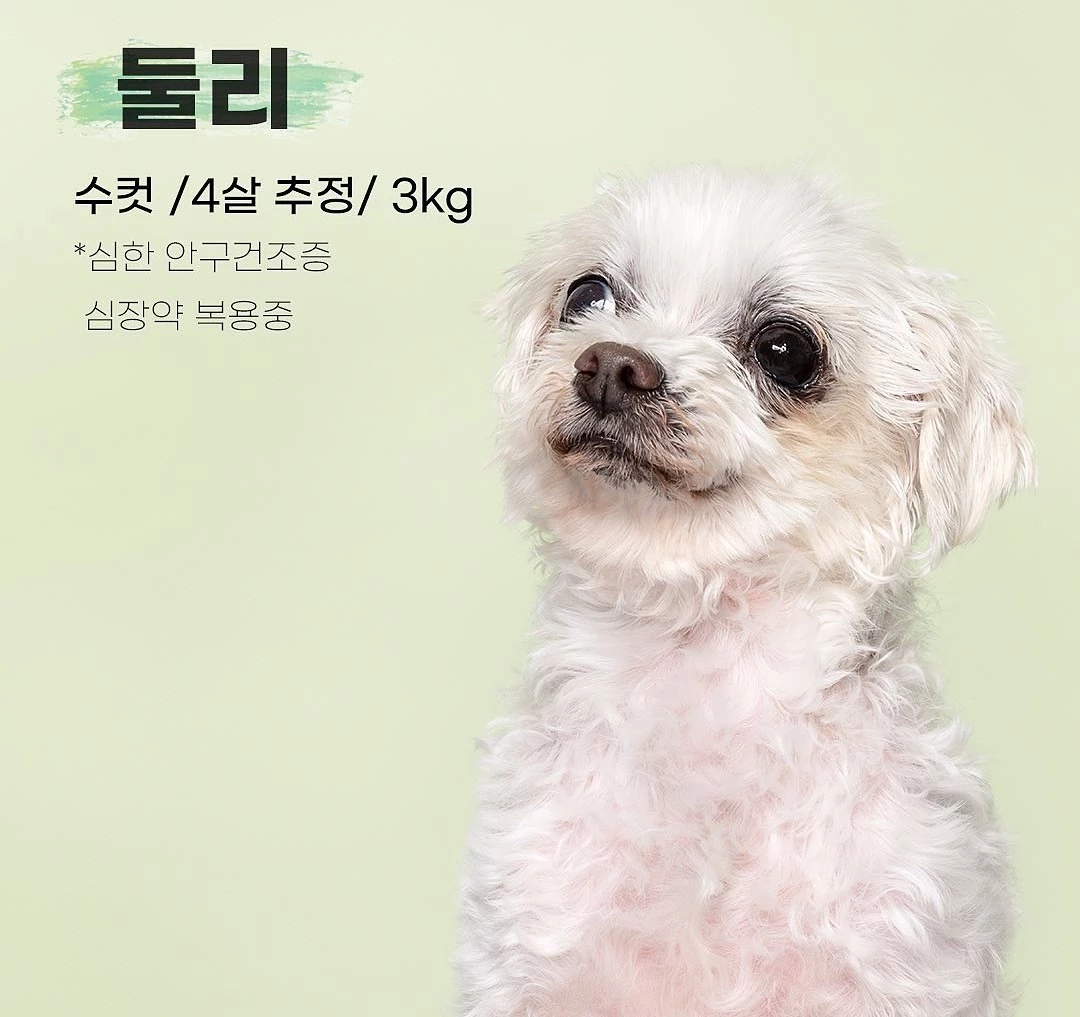 심한 안구 건조증과 심장약을 복용 중인 둘리. 녀석을 따뜻하게 가족으로 맞아주고 싶다면 동물자유연대 페이스북으로 연락하면 된다.