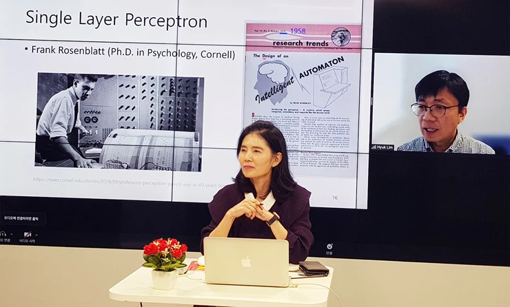 온라인 줌을 통해 70명 이상의 교수들이 참여한 이날 워크숍에서 임혁 교수는 ‘머신러닝과 딥러닝의 이해’를 주제로 인공지능의 1, 2차 암흑기에 역사적 연구배경을 기술기반으로 머신러닝과 선형회귀법의 차별성을 다룬 뒤, 컴퓨터비전과 자연어 처리에서의 딥러닝의 영역을 시각적 개념으로 다뤘다.