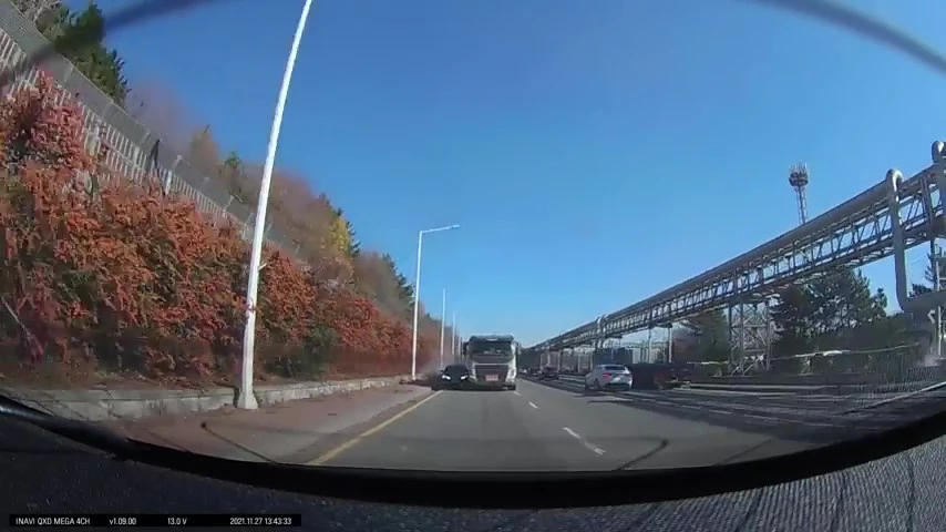 공개된 영상에선 A 씨의 남편이 차를 타고 2차로를 달리고 있었다. 그때 1차로를 달리던 덤프트럭 한 대가 A 씨의 남편이 탄 차 옆으로 다가오기 시작했다. 끝내 덤프트럭이 A 씨 남편의 차 뒷부분과 충돌하며 차가 균형을 잃었다. 다행히 사고를 알아챈 덤프트럭 기사가 속도를 줄이며 대형 사고는 피했다.