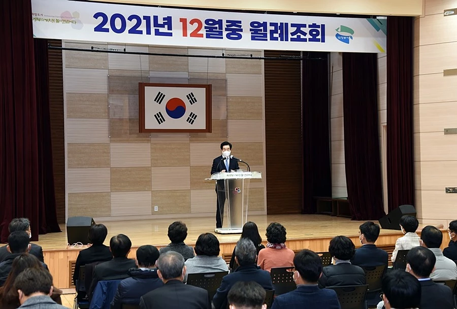 경기 의정부시(시장 안병용)는 지난 6일 백신접종 완료직원 100명 이하로 참석한 가운데 12월 월례조회를 개최해 국민의례 및 묵념, 시상, 5분 프로포즈, 훈시 순으로 진행했다.