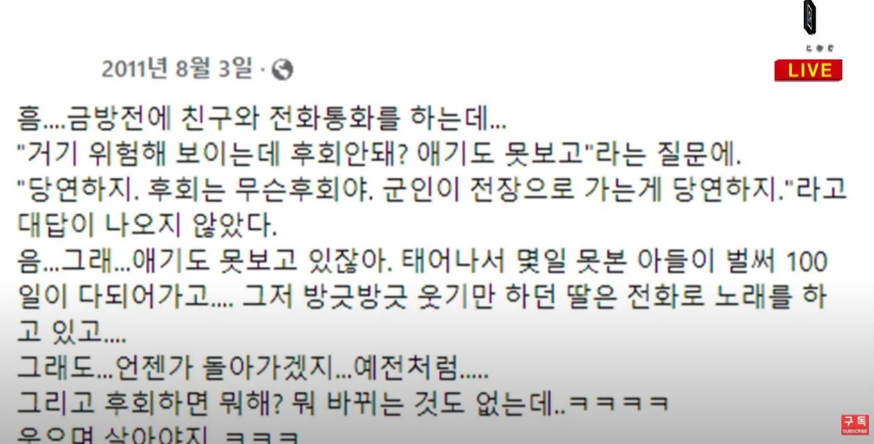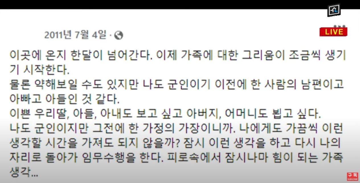 가세연은 A 씨가 조 교수와 결혼 생활 중 아프가니스탄으로 파병을 가 있을 당시 페이스북에 썼던 글 일부를 공개했다.