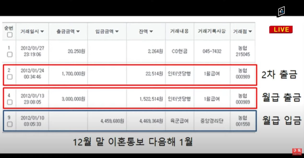 A 씨가 아프가니스탄에 있을 때 당시 아내였던 조동연 교수는 남편 월급의 약 90%를 매달 인출해 썼다. 매달 280만 원 정도 입금되던 위험 수당도 예외가 없었다. 눈길을 끈 건 조 교수가 이혼 통보를 했을 때다. 그는 크리스마스 이브 날 이혼 요구 문자를 보내고 2주 후에도 A 씨 월급을 말없이 인출했다. A 씨 통장엔 2264원만 남았다. 당시 A 씨는 밤 11시에 편의점에서 햄버거를 사먹으려다가 잔액 부족이 떠 이 사실을 처음 알았다.
