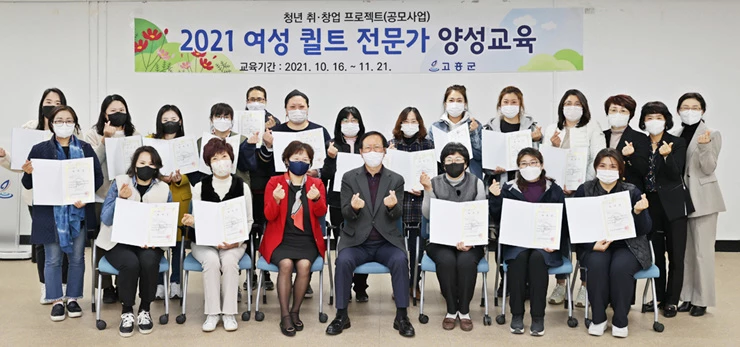 고흥 청춘 홀로세움 아카데미 사업은 ‘2021 전남인구 새로운 희망찾기 프로젝트’ 공모사업에 선정되어, 지난 10월부터 여성 퀼트 전문가, 힐링 시니어강사, 놀이심리상담사 등 전문가 양성교육을 하여 총 80여명의 교육생이 관련분야 전문가 자격증을 취득하였다.