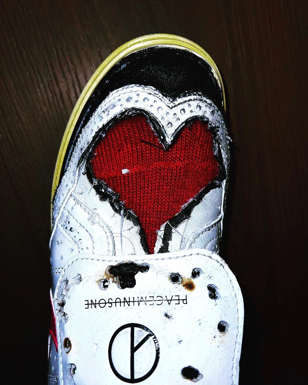 사진에는 운동화 혀 부분에 구멍이 나 있고 불로 지진 듯한 자국이 있는 '지디 운동화, 퀀도1'이 담겼다. 발등 부분을 하트 모양으로 자르는 등 과감한 터치가 돋보인다.