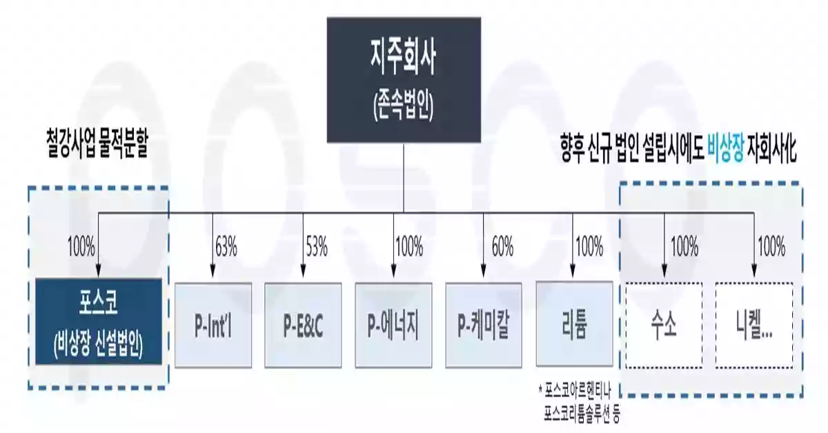지주회사 체제는 지주사인‘포스코홀딩스’를 상장사로 유지하며, 지주회사는 미래 신사업 발굴, 그룹 사업 및 투자 관리, 그룹 R&D 및 ESG 전략 수립 등을 맡는 구조다.