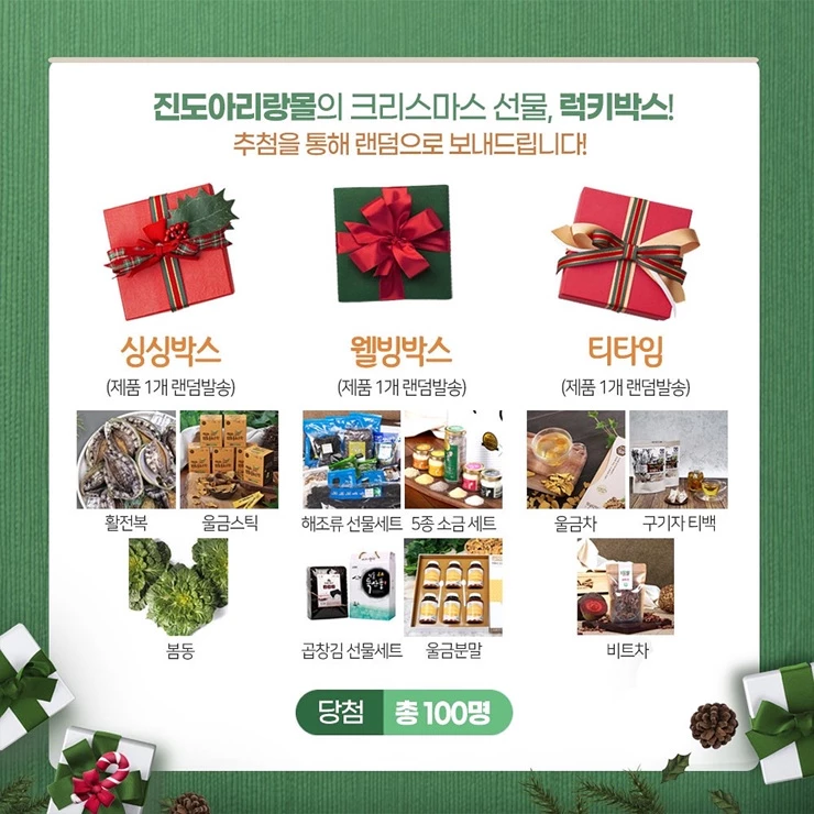 당첨된 100명에게 ▲싱싱박스(활전복, 울금스틱, 봄동) ▲웰빙박스(해조류 선물세트, 5종 소금 세트, 곱창김 선물세트 등) ▲티타임(울금차, 비트차 등) 중 무작위로 1개의 선물이 전달된다.