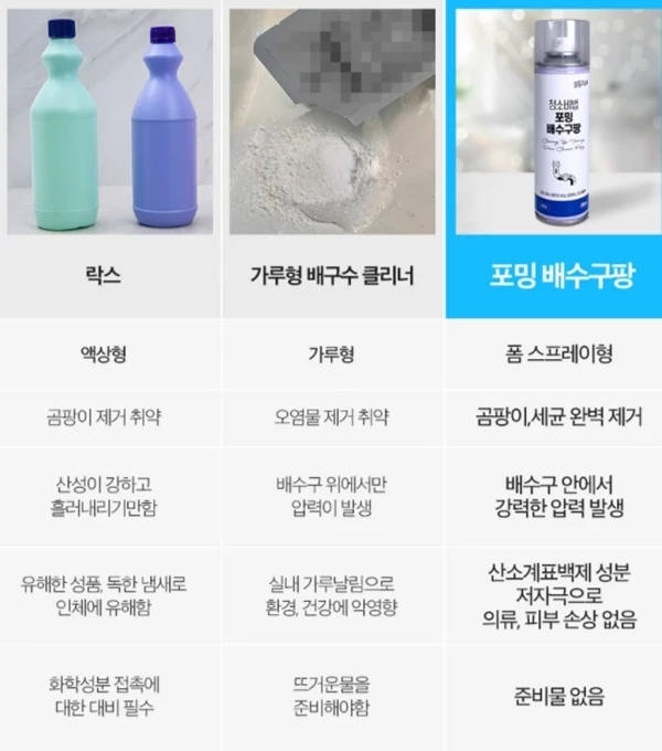 이 배수구팡은 뿌리기만 하면 물이 시원하게 내려가는 고농축 발포 클리너다.