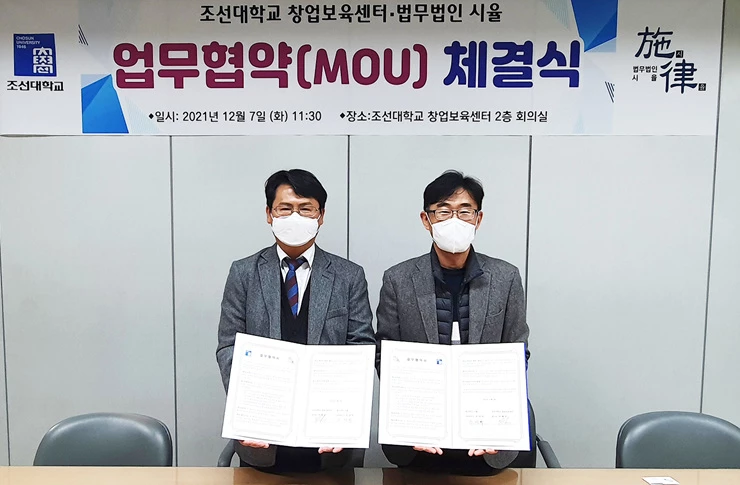 조선대학교 창업보육센터와 법무법인 시율이 입주기업의 법률지원 역량 강화를 위한 업무협약(MOU)을 체결했다.