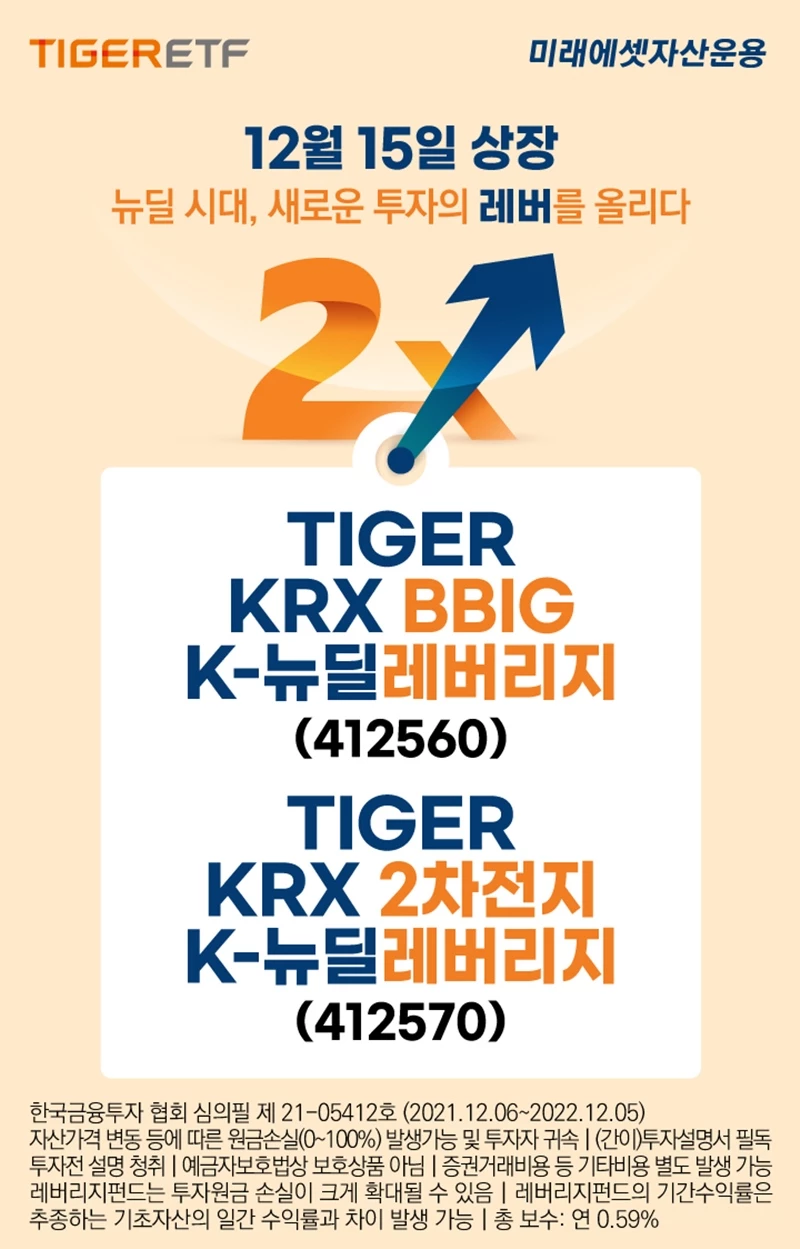 이번에 상장하는 테마형 레버리지 ETF는 ‘TIGER KRX BBIG K-뉴딜 레버리지 ETF’와 ‘TIGER KRX 2차전지 K-뉴딜 레버리지 ETF’다. 지난해 10월 상장한 ‘TIGER KRX K-뉴딜 ETF’ 시리즈 5종(BBIG, 배터리, 바이오, 인터넷, 게임) 중 BBIG와 2차전지의 레버리지 상품이다. TIGER KRX K-뉴딜 ETF 시리즈는 현재까지 1조원이 넘는 자금이 몰렸다.