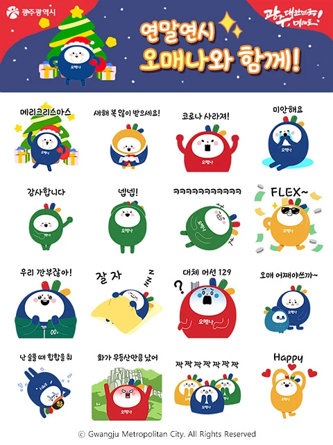 오매나 이모티콘은 ‘메리크리스마스’, ‘새해 복 많이 받으세요!’, ‘2022년엔 코로나 사라져!’, ‘오매, 어째야쓰까!’ 등의 재치 있는 표현을 움직이는 이모티콘 16종으로 표현해 카카오톡에서 연말연시 비대면 인사를 나누거나 일상적인 대화를 할 때 다양한 활용이 가능하다.