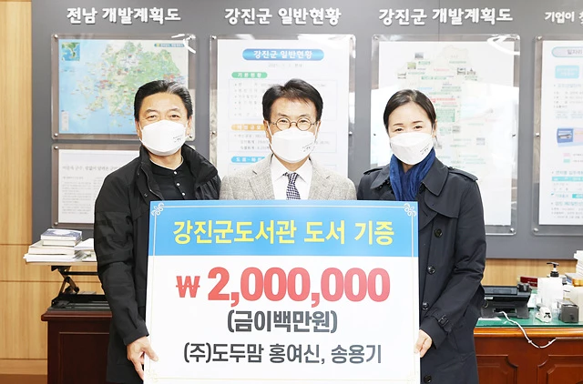 ㈜도두맘에서 지난해에 기증한 200만 원 상당의 도서는 현재 강진군도서관 자료실에 비치되어 도서관을 방문하는 이용자들에게 독서의 즐거움을 느끼게 하는데 크게 기여하고 있다.