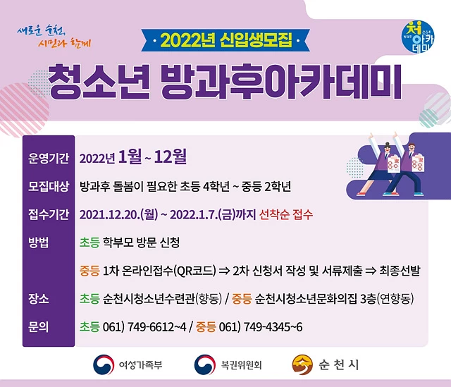 순천시(시장 허석)는 오는 20일부터 2022년도 청소년방과후아카데미 신입생을 모집한다.