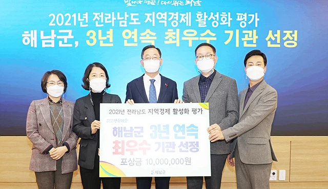명현관 해남군수는“3년연속 지역경제 활성화 평가 우수기관 선정의 영예를 안은 것은 코로나의 어려움 속에서도 경제 활성화를 가장 우선으로 추진해온 점이 인정받은 결과이다”며“청년과 농민・소상공인・기업인들이 다 함께 만들어가는 행복한 지역사회를 위해 지역경제 활성화에 적극 노력하겠다”고 밝혔다.