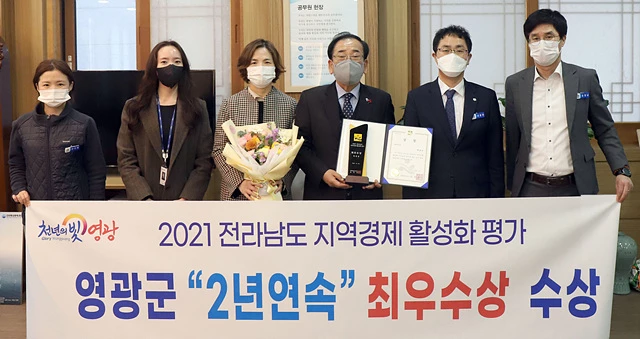 영광군은 지난 29일 전라남도가 주관한“2021년 지역경제 활성화 평가”에서 2년 연속 최우수상을 수상하며, 기관표창과 함께 일천만 원의 포상금을 받았다고 밝혔다.
