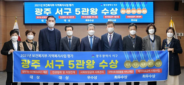 광주시 서구가 보건복지부가 주관한 지역복지사업 평가에서 지난해에 이어 2년 연속 대상인 ▲찾아가는 보건복지서비스제공 분야와 함께 ▲민간협력 및 자원연계분야 대상, ▲지역사회 통합돌봄서비스 제공분야 최우수상, ▲의료급여 사례관리사업분야 최우수상, ▲사회보장급여 사후관리분야 우수상 등을 수상했다고 밝혔다.